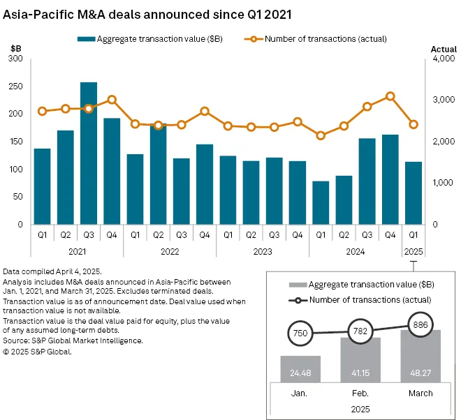 In the first quarter of 2025, Asia-Pacific M&A deal values reached $113.8 billion across 2,416 new deals. This marked a 44% increase in value and a 12% increase in deal count compared to the same period in 2024.